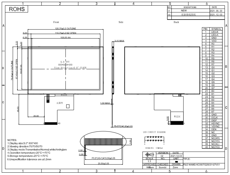 2 | 5" | HC050IG40031-B04V01 | IPS | 800*480 | 120.7*75.8*2.9mm | 108*64.8mm | 40pinRGB | 1000 | 400 | -20~70℃ | -30~80℃ |